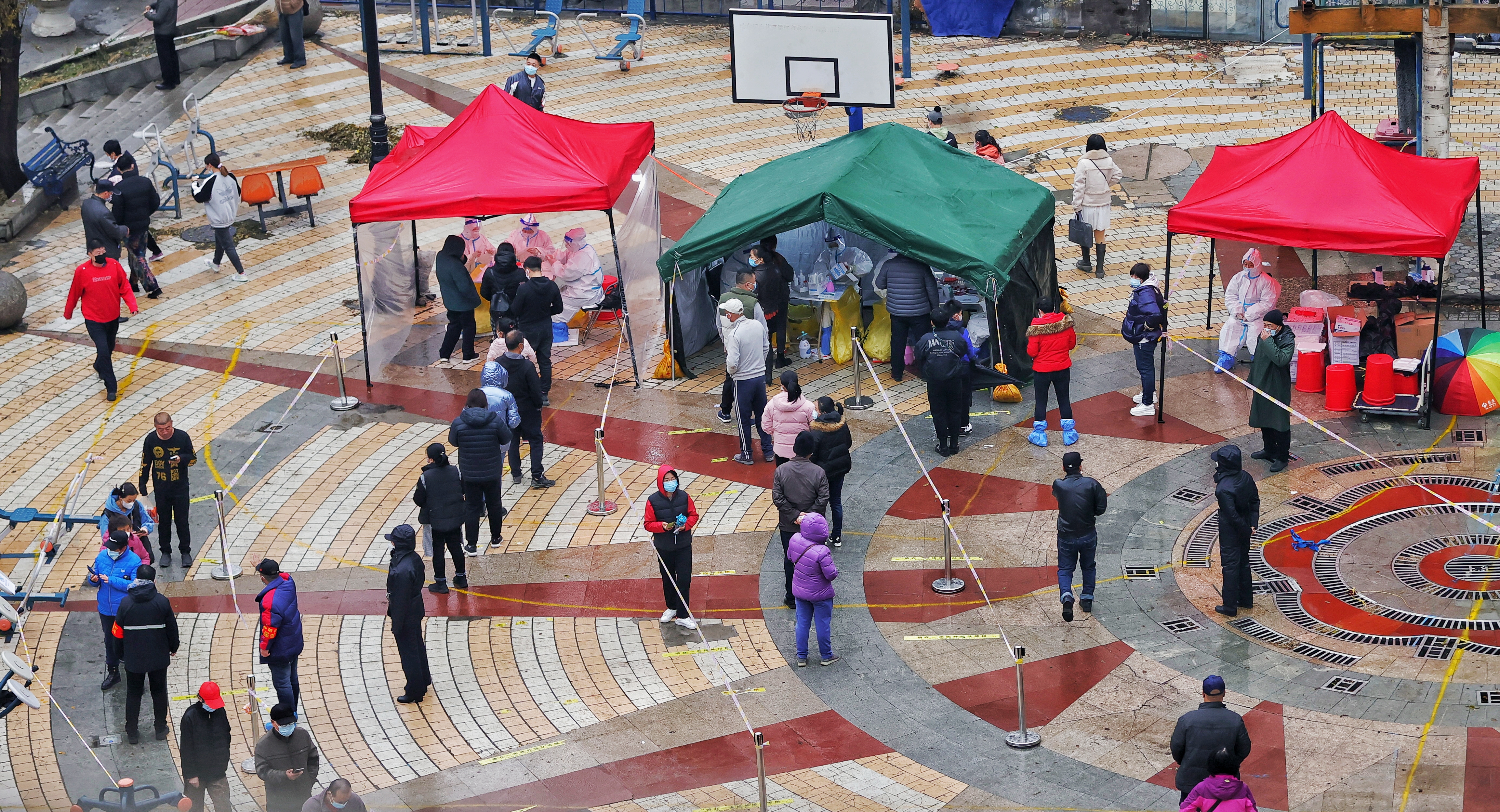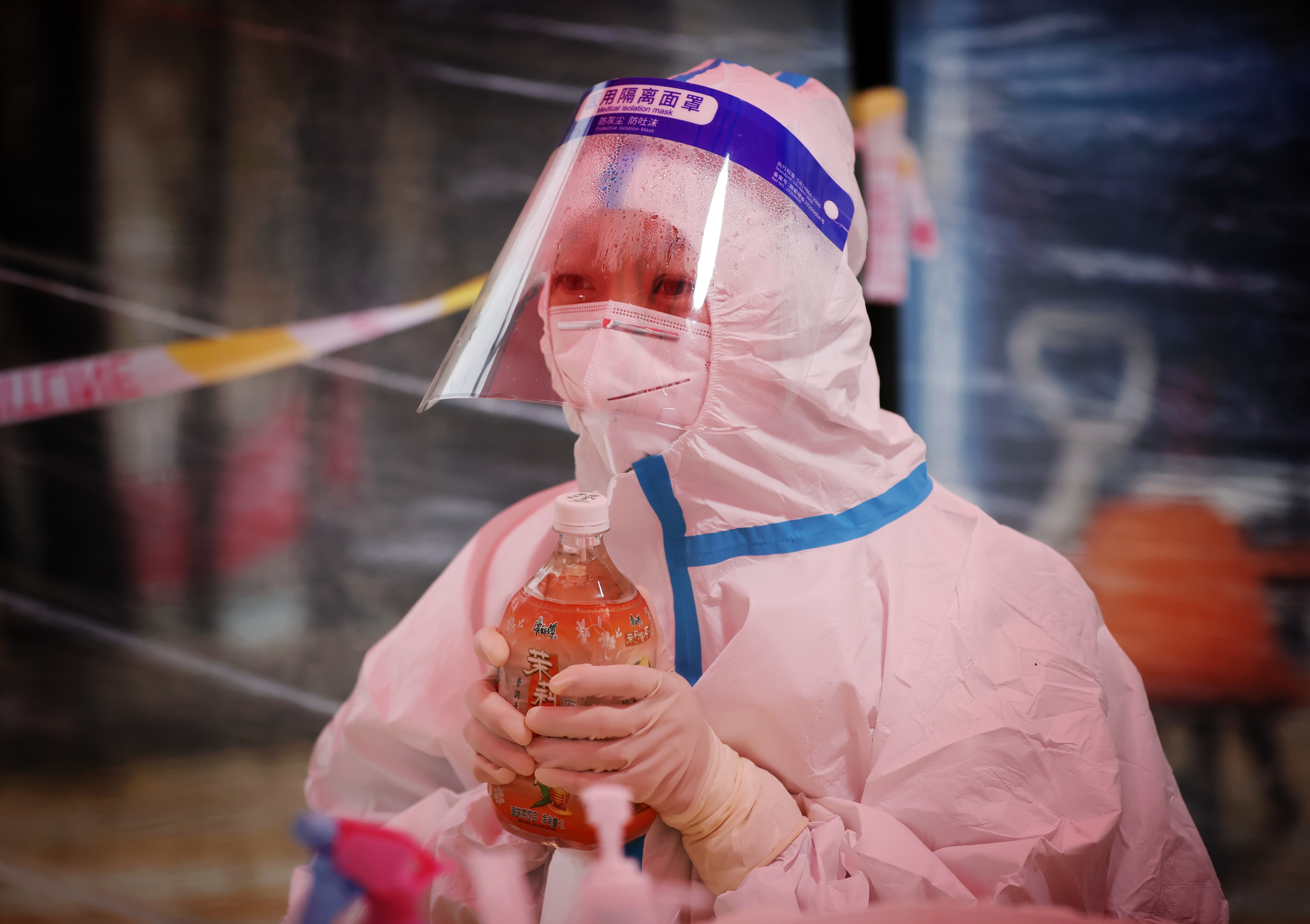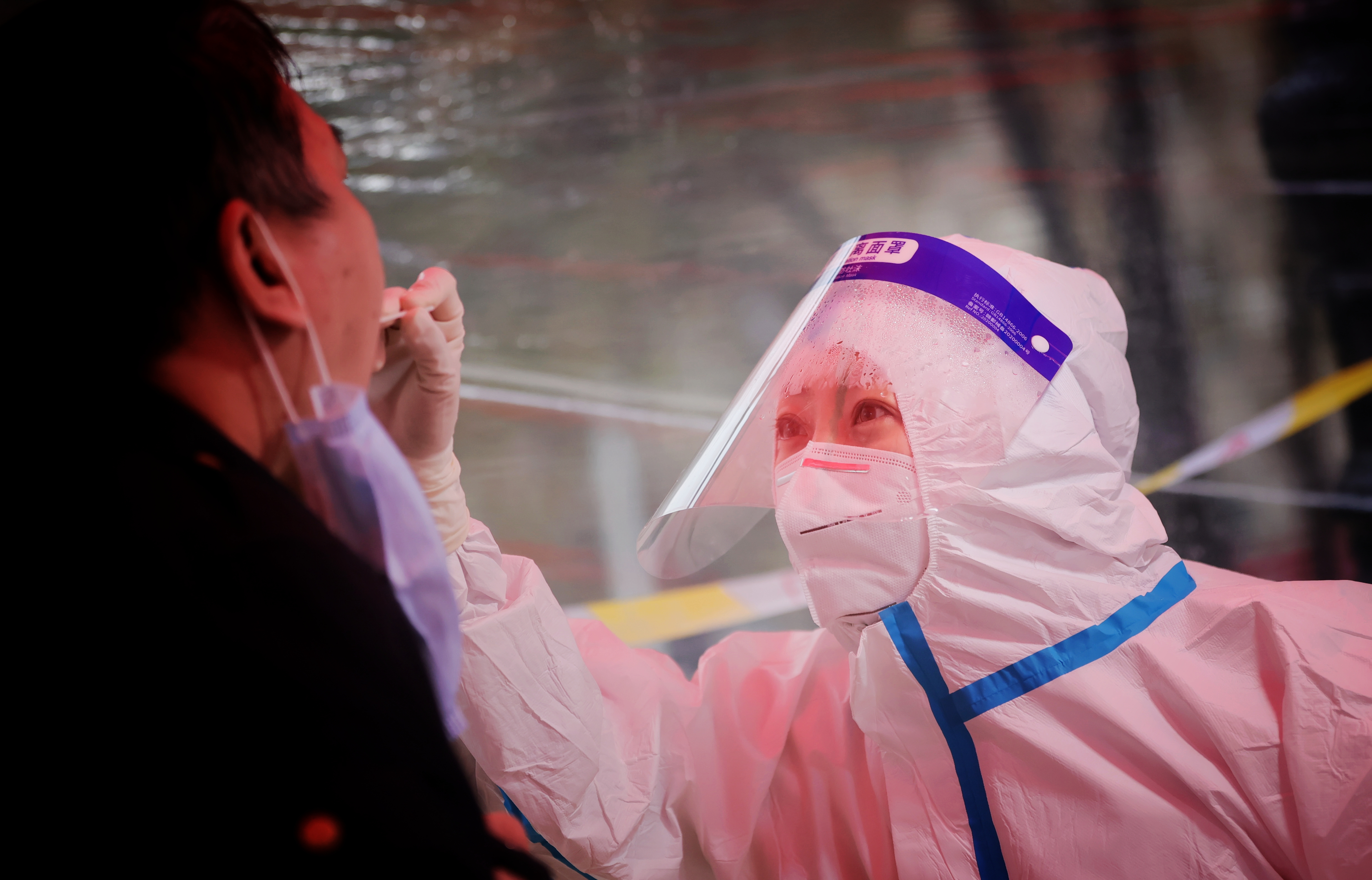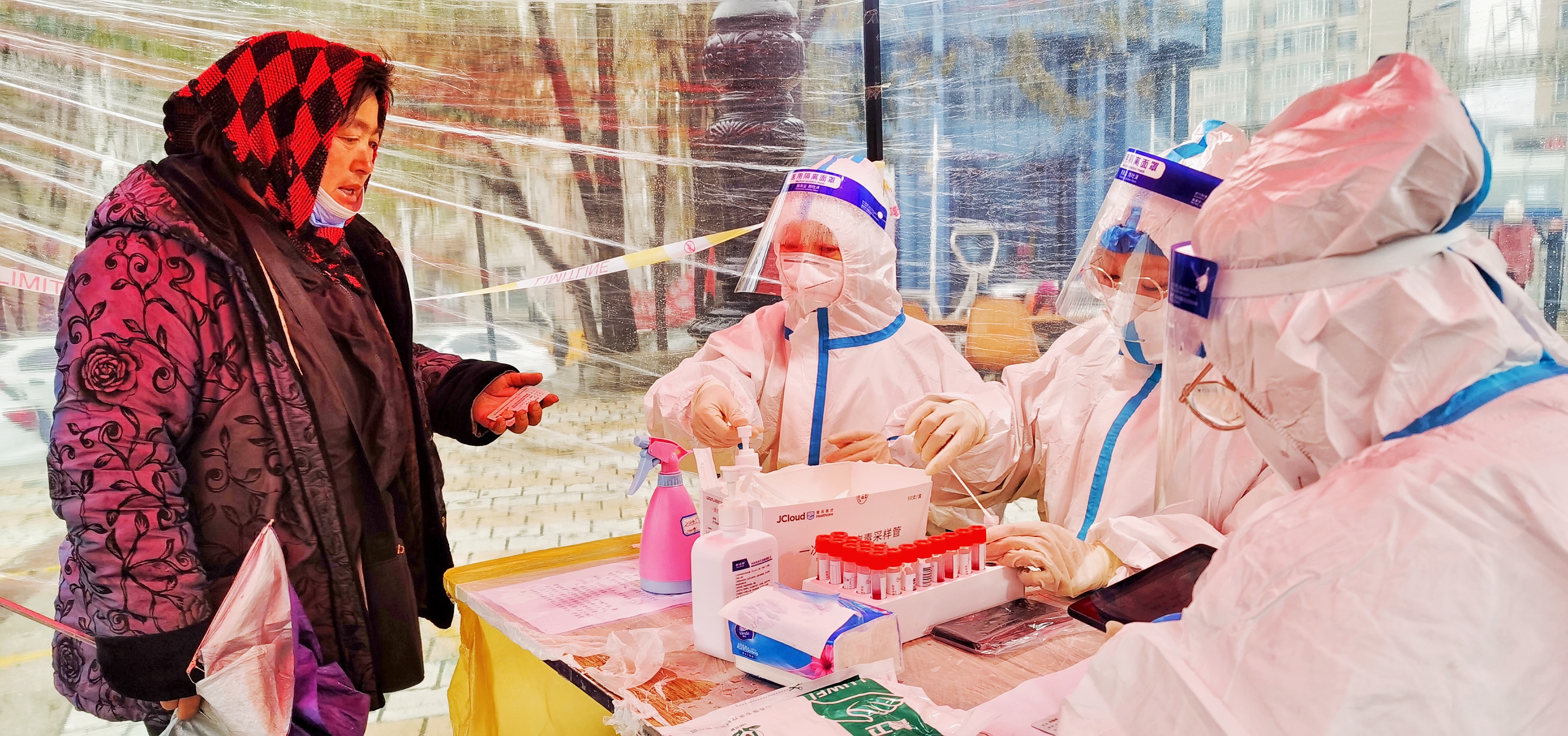 哈爾濱市第一人民醫(yī)院的醫(yī)護(hù)人員在核酸檢測(cè)取樣