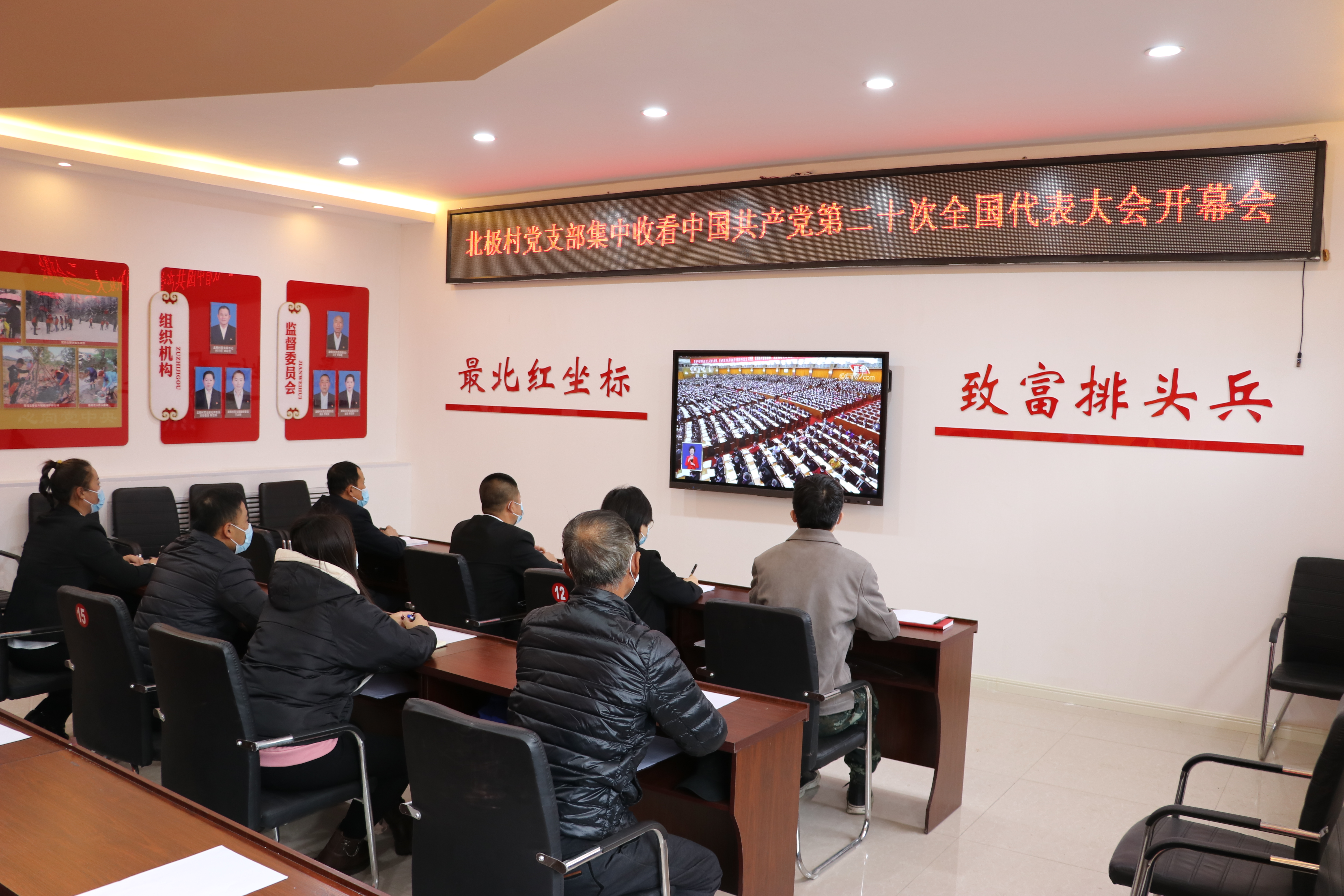 10月16日上午,在神州北極,各界干部群眾歡欣鼓舞,認真收聽收看黨的二十大開幕盛況。