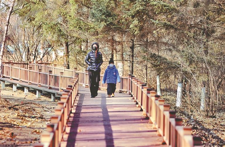 近日,哈爾濱市地鐵二號(hào)線冰雪大世界2A口外,游人在觀光棧道上散步。